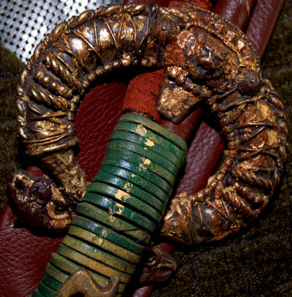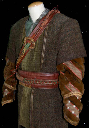 Description: A costume featured in the Star Trek: Enterprise episode “Judgment”; wherein “Captain Archer” (Scott Bakula) is charged as being an enemy of the Klingon Empire for helping “rebels” escape custody. This costume is for wear by veteran Trek actor J.G. Hertzler in the role of the Klingon advocate assigned to defend “Captain Archer” (Scott Bakula), “Kolos”, it consists of short-sleeve, mid-riff undershirt sewn onto a “chainmail” dickie, a long-sleeved, dark-green, chenille jacket featuring a textured stripe pattern and brown, faux-fur sleeves, a diagonal stripe of lighter brown faux-suede wrapping around the sleeve with red trim itself; acrylic “button” and coiled, gold-colored metal accents near the cuffs. A short-sleeved, full-length, dark-brown/olive-colored wool robe with faux-suede detail down the lapel; a wide, brown leather belt/harness featuring different colors and styles of coiled leather and itself wrapped in differing styles and colors leather cord; a gold-colored buckle accent on the harness and stray cord at the waist that hangs free. This actor is better known for his portrayal of the Klingon General or became High Chancellor, “Martok”. A sewn in tag reads ‘Enterprise, J.G. Hertzler #45’ and the costumer’s tag reads ‘Enterprise #045 Judgment, Kolos, J.G. Hertzler’.