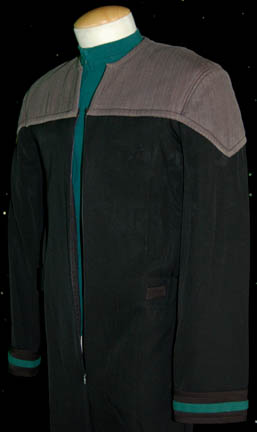 Description: A Star Trek: Deep Space Nine male Sciences Blue Starfleet uniform made for wear during the series. The jumpsuit is black with gray quilted shoulders, blue trim around the cuffs, Away Team gear loops around the waist, a zip up the front and a small Velcro patch on the left breast for a combadge (not included) to attach. Worn underneath is a long sleeved Sciences Blue shirt also with a zip up the front. Costume comes complete with costume tag.