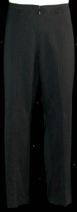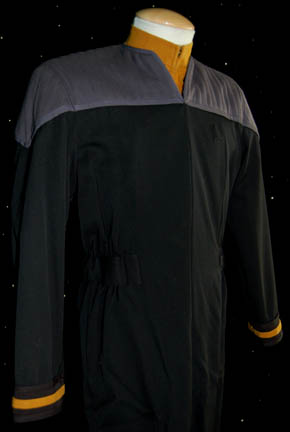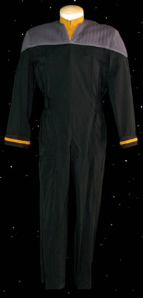 Description: A First Contact-style” Starfleet uniform, called this because it was first used in the feature film of the same name and went on to be the standard; it is a long-sleeved, full-length, black jumpsuit featuring blue-gray, quilted shoulders, a Velcro patch for a commbadge (not included), Operations Gold division colors around the cuff, a matching Operations Gold, long-sleeved undershirt, and stirrups for the feet. Also included are some black, uniform trousers which possess a sewn in tag that reads ‘Star Trek VII, LeVar Burton’ but also possess a costumer’s tag that denotes LeVar Burton they never worn. The sewn in tag on the jumpsuit reads ‘LeVar Burton, Geordi #3’ but the undershirt denotes use by LeVar Burton and his photo dbl, Scott Somers.
