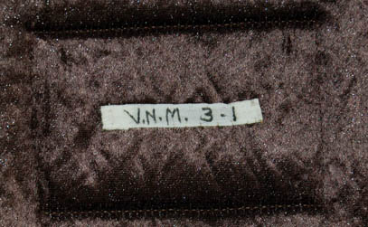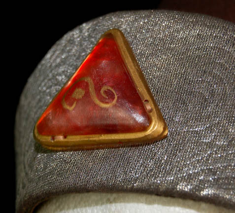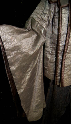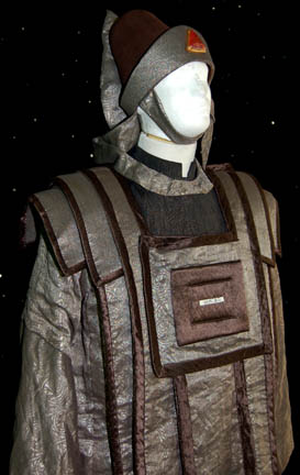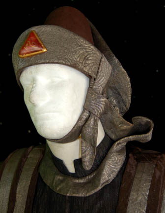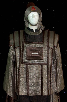 Description: A costume featured in Star Trek IV: The Voyage Home during scenes taking place in the Federation Security Council at the beginning and end of the film. This elaborate costume is a black sparkle fabric robe with a mandarin style collar and matching trousers for wear underneath a sturdy, weighty fabric ‘armor’ that is pleated to appear plated. The ‘armor’ is made from patterned fabric with dark copper colored trim, a placement in the center of the chest for a missing Vulcan gem badge, and has sleeves, thin near the body but dropping into kimono style bell sleeves near the cuffs. The costume also comes with a plum colored felt hat with a silver fabric chin strap tied at the side and an affixed red Vulcan ‘gem’ badge on the forehead.