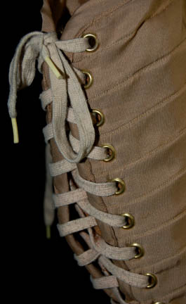 Description: A Federation Security Council alien costume appearing in Star Trek IV: The Voyage Home. The costume is a set of tan boots with upturned toes appearing to have leather soles but with a rubber bottom, matching tan synthetic trousers, a tan suede top with crumple textured sleeves that are pleated for lining, and a wide brown belt with rope tassels. The costume top features a pair of affixed resin shoulder armor scales and a decorative necklace-like element.