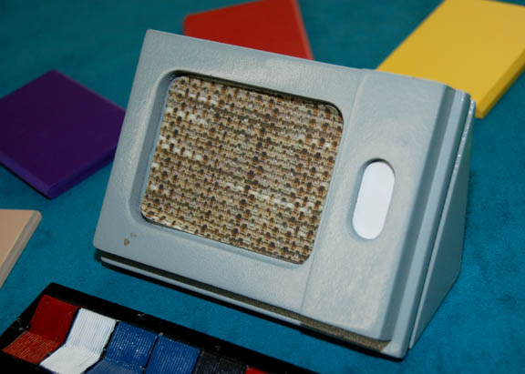 Description: A prop lot featured in the Star Trek: Enterprise episode “In a Mirror, Darkly: Part II”. The item is a shaped wood desk communicator appearing on the set of the hijacked “Starship Defiant” which is painted light blue, has an inset ‘communications receiver’ that is adorned with a graphical application to match those appearing in Star Trek: The Original Series. Remains of adhesive that was used to place the item on a table is still present. Item measures approx. 4.75 X 3 X 2 inches. Also present are a set of seven prop micro cassettes featured in the same episode. The items are made from colored sheet plastic with beveled edges and are colored green, yellow, beige, blue, red, purple, and white. Items measure approx. 3 X 2.25 X 0.25 inches. Finally, a faux button board is present made from molded resin painted black with red, black, blue, and white painted buttons molded into a static position. Item measures approx. 6 X 1.75 X 0.25 inches.