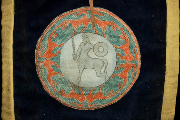 Description: A piece of set dressing featured in the Star Trek: Voyager episode “Heroes and Demons”; wherein “Harry Kim” (Garrett Wang) is taken and other crew members disappear inside a “Beowulf” holodeck program and “The Doctor” (Robert Picardo) has his first away mission to rescue them. This item is a banner found hanging in Hrothgar’s great hall when “The Doctor” follows the hologram “Freya” there in his search for the missing crew members; it is a rectangular banner of rough fabric, featuring yellow trim, brown leather cord to hang it with, green fringe at the bottom, a main, blue background of deep blue with an depiction in the middle of a centaur with a sword and shield, surrounded by a circle of stylized animal-like figures with human heads. The item measures approx. 29 X 16 inches with a negligible height.
