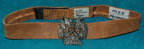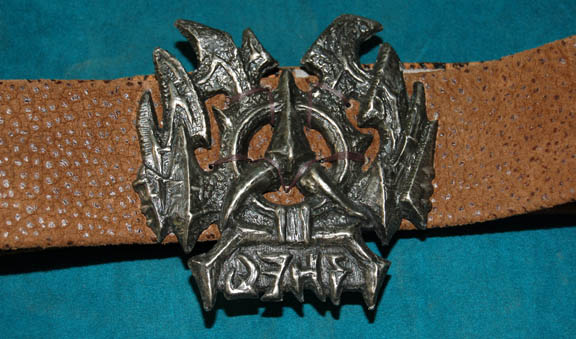 Description: A Klingon belt made for wear during the filming of Star Trek episodic television. The belt is made of brown leather over a woven base with a Velcro fastening in the back. The impressive buckle is made of metal with the Klingon emblem in the center and Klingon text underneath. Measures approx. 40 inches length.