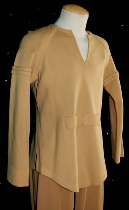 Description: A tan colored long sleeved Class-B Starfleet uniform featured in Star Trek I: The Motion Picture. The costume is tan trousers with a uniform top that comes with these unattached elements: a bio-monitor, an orange backed sciences division Epsilon IX assignment patch for the left breast and a pair of orange division-rank strips with a thin line of gold colored thread embellishment. The costume is intended for male wearers.