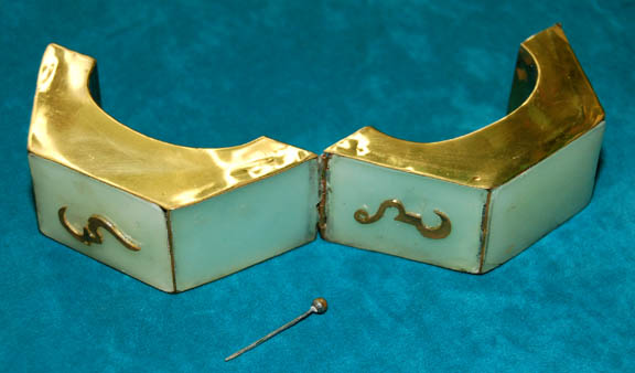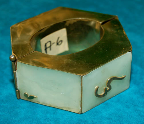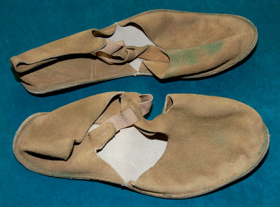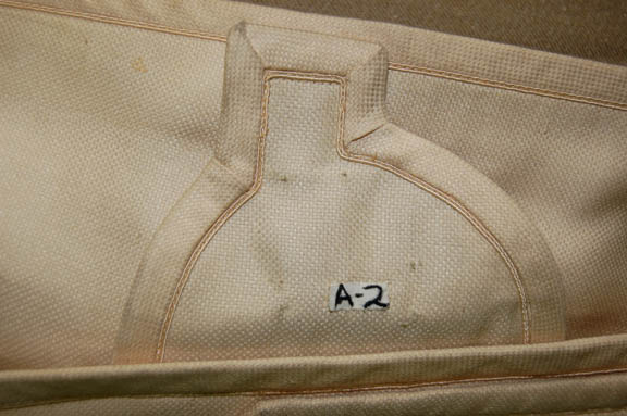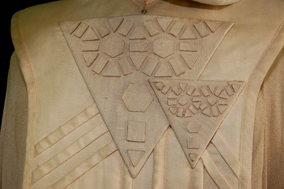 Description: A costume appearing first in Star Trek I: The Motion Picture for wear by the Vulcan Kolinahr master who was to award “Spock” (Leonard Nimoy) a totem of pure logic, and later in the closing scene of Star Trek III: The Search for Spock, possibly for wear by Spock’s mother, “Amanda Grayson”. The costume is a long beige robe with pleated sleeves and a sheer hood worn underneath a thick, cream colored over robe that is adorned with Vulcan mosaic styled leather on the back and bells out toward the ground in two lengths in the front. The over robe is stained near the hem on the reverse due to time and storage conditions and is also very long and acts as a train; numbered and lettered tags are sewn into strategic locations on the costume for the placement of Vulcan badges which are not accompanying. A pair of slippers are present which were located with the costume, they are tan leather, and a single hexagonal gold colored metal bracelet with teal colored ‘gem’s and Vulcan iconographic symbols. Costumer’s tags read ‘Star Trek V, Amanda C1 Scn. 179-185’ and ‘mom off camera Amanda C1’.