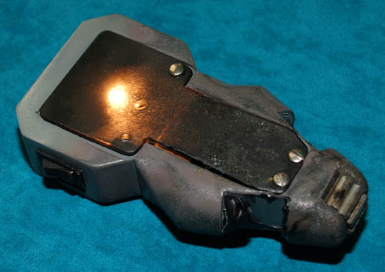 Description: A distressed TNG-style prop medical scanner made for use on the Star Trek: The Next Generation series. The scanner is made of resin painted gray and black to appear burned with metal components added for detail. A small button on the side activates two sequentially flashing red LED lights in the center. When the switch is flipped in the opposite direction the red lights flash and a backlit beveled screen lights at the top. The prop is powered by a standard 9Volt battery (Not included) that is accessed by removing the back panel with a flat tip screwdriver. One of the screws is missing but the back panel stays in place. Measures approx. 5 x 2 ½ x 1 inches.