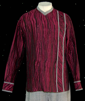 Description: A costume featured in Star Trek V: The Final Frontier for wear by Leonard Nimoy in his portrayal of “Spock” while camping in Yosemite National Park. The costume is a set of trousers with purple chevrons on the lower legs, a purple wood patterned long sleeved shirt with gray accents and remaining threads where details have been removed, and a denim button and Velcro front jacket with fluorescent green accents on the forearms, and pocket flaps. The sewn in Paramount tags in the trousers wear ‘Spock Nimoy Har.’ and ‘Spock Double nylon harness’. The costumer’s tags read ‘Spock, reg Fit’, ‘Star Trek V, Leonard Nimoy as Spock, Chg#1, 1A’, Lenard Nimoy, Spock Camping’, and ‘Leonard Nimoy, Spock’.
