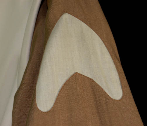 Description: A costume featured in Star Trek II: The Wrath of Khan for wear by “Jedda” (John Vargas), a Regula I researcher who gave his life to protect Project Genesis from “Khan” (Ricardo Montalban). The costume is a brown colored long sleeve shirt with white arrowhead shaped accents on the sleeves, and a white colored asymmetrical front vest with an affixed resin multi-colored accents badge on the chest. The vest features a sewn in Paramount tag reading ‘J. Vargas’.