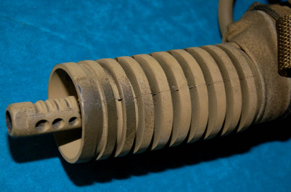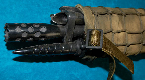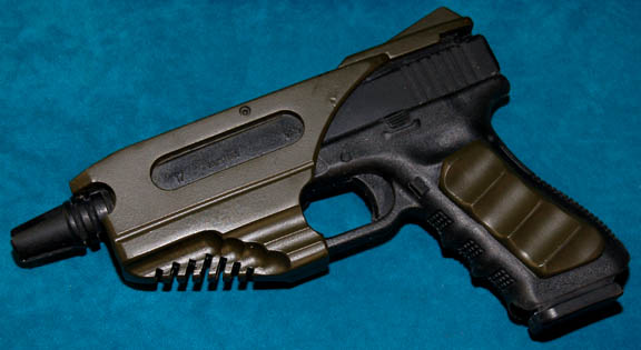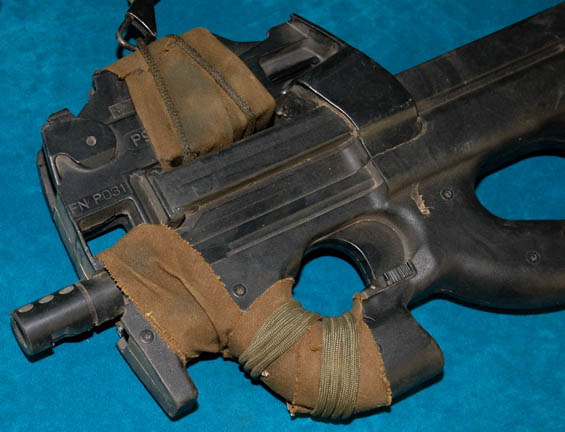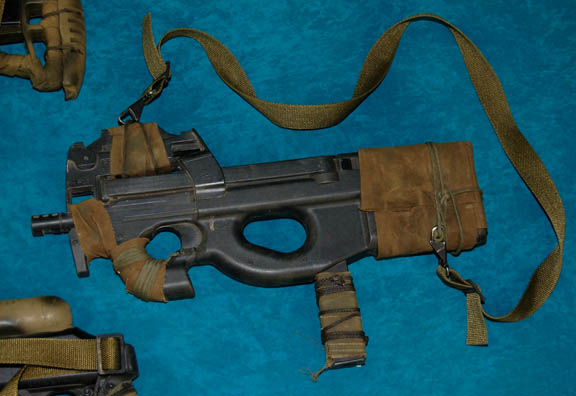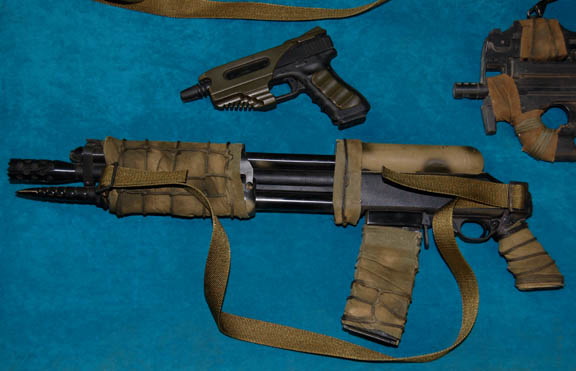 Description: A set of four prop firearms featured in Star Trek X: Nemesis for use by Kolaran raiders. The lot consists of four high quality molded rubber prop firearms, black in color with olive drab colored fabric wrappings. The items are a ‘shotgun’ with a shoulder strap and a banana clip style magazine, a handgun molded to feature a slide action which is in a fixed position, a sub-machine gun with half a banana clip magazine (there is no indication as to whether or not the clip was broken, or cut away purposefully) with an attached gas cylinder, and another sub-machine gun with a bull-pup loading receiver configuration. The largest item measures approx. 29.5 X 9.5 X 3.5 inches while the smallest measures 10 X 6.75 X 3 inches.