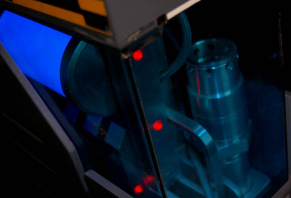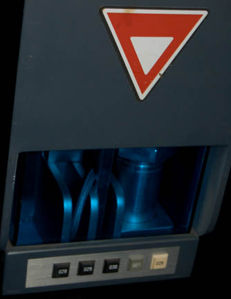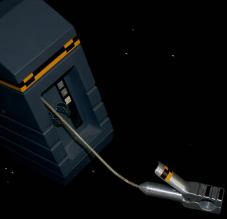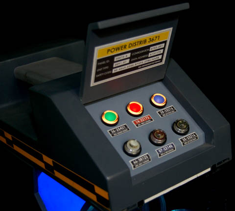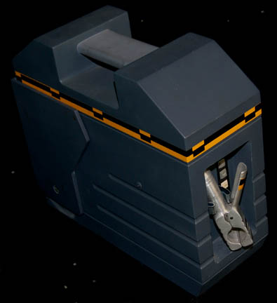 Description: A Starfleet power cell made for use on the Star Trek: Enterprise episode, “Fight of Flight” in which the NX-01 Enterprise crew found an abandoned ship filled with dead corpses. The power cell case is made of gray resin with a carrying handle on the top and yellow and black adhesive along the sides. The front panel lowers to reveal blue Plexiglas with metal instruments inside. Above is a click-to-open door with six buttons inside and multiple Starfleet labels. When pressed the blue button lights up and also lights up a blue cylinder inside the Plexiglas. The red button lights up when pressed and lights up three small red lights also inside the Plexiglas. The green button lights up but it does not activate anything on the inside of the case. The three lower buttons have clear rubber button tops attached. They click up and down but don’t activate anything. The buttons are all powered by two standard 9Volt batteries (not included) located in the bottom of the case. An Allen wrench (Hex Key) is needed to access the battery compartment. At the rear end of the case is a metal grip on a retractable metal cord and faux buttons. Measures approx. 16 x 6 x 14 inches.