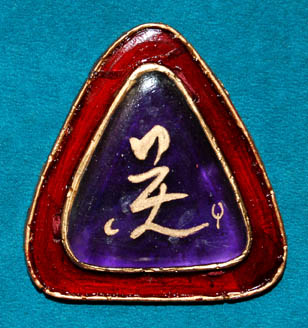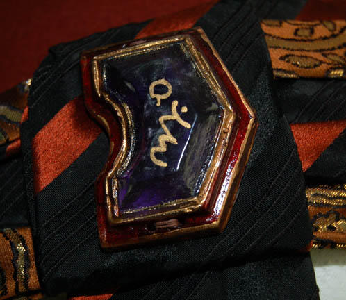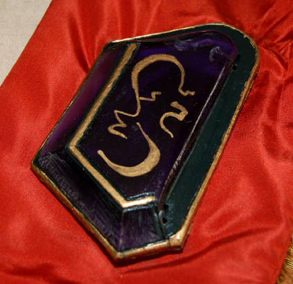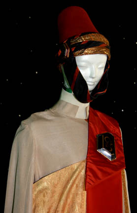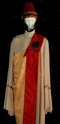 Description: A costume similar to those featured in various instances in the Star Trek Original Series style feature films. This costume is a long-sleeved, full-length, beige, kimono-style Vulcan robe featuring copper-colored trim with gold-colored thread floral-print, a long, over-the-shoulder, peach-colored sash with a gold-colored print, and a wide rust-colored stripe including a purple “jewel” with Vulcan iconographic symbol in it. A rust-colored, Vulcan-style, steeple hat ringed with two types of fabric; black and rust striped design that is tied together with another an orange and black floral pattern that matches the trim on the robe, and a red “jewel” clasp with a Vulcan iconographic symbol in the middle.