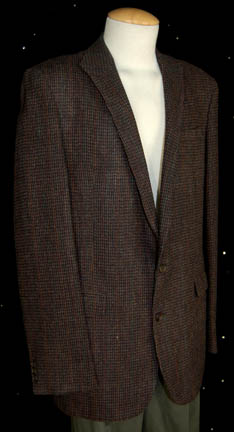 Description: A costume featured in the Star Trek: Enterprise premiere episode “Broken Bow”; wherein Earth launches its first exploration starship and has its first encounter with a Klingon in a mission to return him to his home world. This costume is for wear by James Cromwell in the role of the inventor and first man to travel at warp speed, “Zefram Cochrane”, and is specifically from the dedication he may for the construction of the Warp Five complex; a long-sleeved, brown suit jacket featuring subtle, multi-colored, vertical stripes, three functional pockets, and some olive-colored Dockers brand trousers. A sewn in tag reads ‘Enterprise, James Cromwell’.