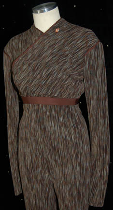 Description: A costume made for wear by Jolene Blalock during the first season of Star Trek: Enterprise this single piece jumpsuit was tailored to her measurements. T'Pol was still a member of the Vulcan High Command when she joined the Enterprise crew on their mission to the Klingon homeworld in “Broken Bow", and it wasn’t until they ventured into the Delphic Expanse in the last episode of the second season that T’Pol resigned her commission to become a member of Earth’s Starfleet, thus changing her uniform. This form fitting costume has shades of brown and tan, a brown band at the waist, a wrap design at the bust, a matching belt, black leather boots, zips up the back and features a SubCommander rank pin that goes on the left colar. This costume is one of the last ones of its kind thus far located.