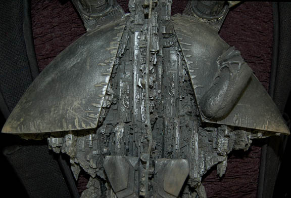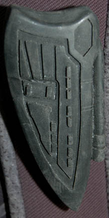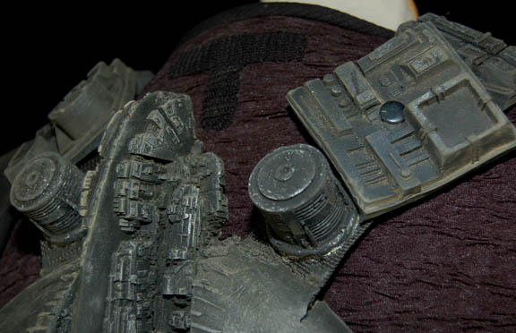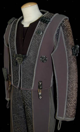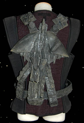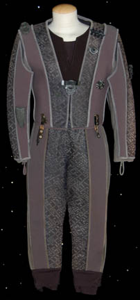 Description: A costume featured in the Star Trek: Deep Space Nine episode “Hippocratic Oath”; wherein “Dr. Bashir” (Alexander Siddig) tries to help a group of Jem’Hadar on free themselves of their dependence on ketracel white. This costume is for wear by veteran Star Trek stunt man and extra Michael bailous, it consists of a sleeveless, full-length, jumpsuit with the top half a black, spandex-like material, the bottom being neoprene over a gray fabric featuring a starburst pattern down the middle and stirrups for the feet. Also included is a vest of further neoprene under sections of black, lattice textured and wrinkled fabric separated into further sections by oversized black piping, a distressed jacket matching the lower-half of the jumpsuit, faux suede around the collar, fabric, an unattached pocket that is supposed to go on the right leg, a wide belt and bandolier featuring intricate rubber and molded foam accents that have started to dry out due to time and storage, multiple loose costume accents with rubber, resin, or metal components and some with Velcro placements. A sewn in tag reads ‘Michael Bailous, lot 9, size 44’ with tags for two other actors sewn in as well. A set of concept drawings presented as Original and duplicated copy art work created for the episode "Hippocratic Oath" of Star Trek: Deep Space Nine. When "Dr. Bashir" (Alexander Siddig) and "Chief O'Brien" (Colm Meaney) come across a group of rogue Jem'Hadar soldiers trying to release their addition to the drug ketricel white, the doctor is forced to help them despite being held hostage by them. The drawings are a variety of workmanship, some appear to be thumbnail sketches with inked in details and borders for photocopy (as the blue pencil marking are not supposed to show up on the duplicates), and painted alterations for color. One set is what appears to be an original of the plasma device featured in the episode composed of both Jem'Hadar and Federation technology, with two finalized photocopies, and one work copy. Second, a work copy of a 'molecular synthesizer' inked and one marker painted for color. A set of Jem'Hadar 'standards' (graphics for use on banners, flags, display screens, patches, etc.), as a work print and a finished copy; an inked thumbnail work print of a Jem'Hadar uniform with details and terminology for all of the intricate accoutrements associated to the uniform tops, a second one is marker painted. Another work print and an ink print indicate the concept of a Jem'Hadar forearm phaser or tricorder. Three more sketches show the same but from differing viewpoints and with different technology, one is marker painted. Another presents 'Tricorder Giblets', and finally one indicates the concept for a new "USS Defiant" captain's chair head pad piece, humorously to say the least. All of the sketches are signed by 'John Eaves' or feature photocopied signatures, were located in a folder listed as '#475 Hippocratic Oath', and measure approx 17 X 11 inches on white paper.
