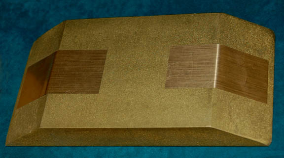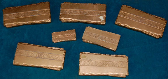 Description: Latinum is a fictional substance seen in the Star Trek: Deep Space Nine series. It is the only valuable substance available in the 24th century that can't be replicated and is most valuable in liquid form. It is incased in worthless gold to create latinum bars used as currency. The lot consists of three bricks of latinum consisting of trapezoidal shaped pieces of wood painted metallic gold, one of the items features strips of metallic gold adhesive and the bottom is not painted; next are five bars of solid cast resin, one with a fleck of paint missing, all with molded ‘etchings’ on the top, a single strip of latinum, and a slip. The bricks measure approx. 7.5 X 3.25 X 1 inches, the bars 2.5 X 4.75 X 0.5 inches, the slip 3.5 X 1.75 X 0.25 inches, and the slip 2.5 X 1.25 X 0.25 inches.