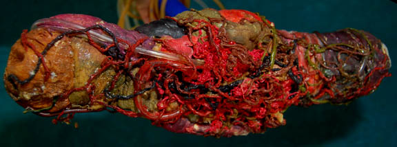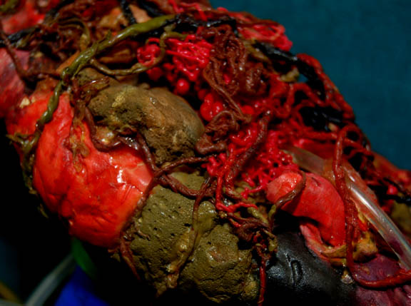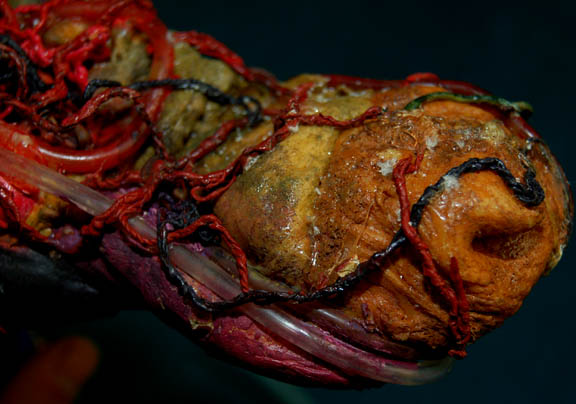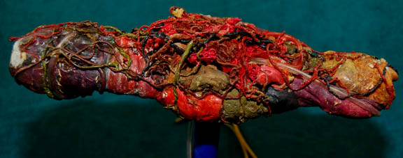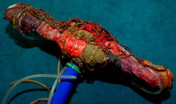 Description: A special effects item featured in the Star Trek: The Next Generation episode “Phantasms”. When the crew of the “USS Enterprise-D” becomes infected with creatures that do not exist in the same reality, “Data” (Brent Spiner) begins to detect them in his android dreams. The item is a special effects ‘creature’ made from multiple elements of multi colored of foam rubber with embedded balloons and affixed tubing. When air is forced into the tubes an expansion occurs that generate a throbbing, pulsating effect as viewed on screen, but due to computer generated effects, on a much smaller scale. The item is mounted onto a metal rod painted blue for blue-screen use and the tubes are visible on the outside of the creature, but run through, or around the outside of the tube. Costly physical special effects like this are becoming a rarity in television production. The creatures measures approx. 12 X 3.5 X 3 inches and the rod extends away from it 10.25 inches.