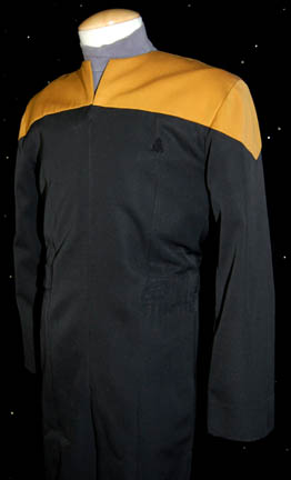 Description: A costume featured in various episodes of Star Trek: Voyager for wear by Alexander Enberg in the role of the Vulcan engineer “Vorik”. This costume is the earlier DS9/Voyager style Starfleet costume consisting of a long-sleeved, full-length, black jumpsuit with Engineering Gold division colors around the shoulders, a Velcro patch for a commbadge (not included) hoops for tools at the waist, a zip down the front, stirrups for the feet, and a long-sleeved, blue/gray undershirt. A sewn in tag reads ‘Voyager, Alexander Enberg’.