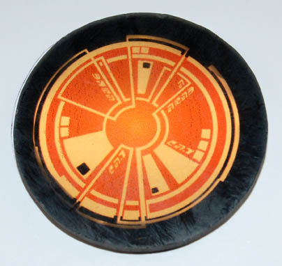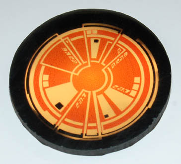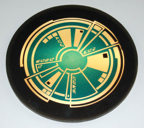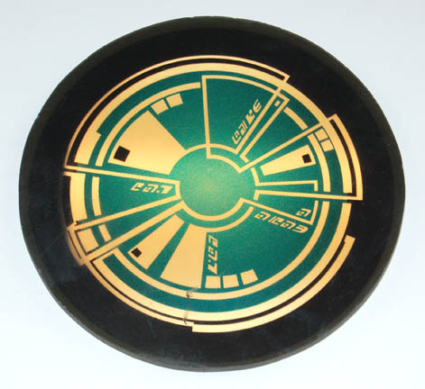 Description: A set of four smoked acrylic disks, two of one size, the other two larger, featured in Star Trek episodic television. The disks are made for console insets and the graphical applications adhered to the reverse are visible when back lit. The larger items depict a green hued asymmetrically rounded display with Ferengi lettering in several spots, the smaller items are similarly designed with an orange color scheme. The smaller items measure approx. 3.5 inches diameter, the larger two 6.25 inches in diameter.