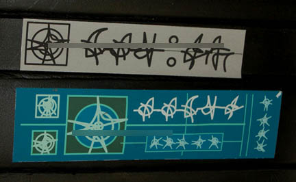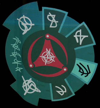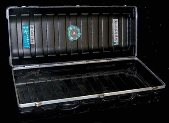 Description: A large black plastic case featured in the Star Trek: Enterprise episode “The Shipment” in which the Xindi-Arboreals shipped their stock of kemocite. The item features a pivoting handle on the top and two more on the side that it shugly against the case for a smaller profile, the rims of the hinged lid are silver colored metal, and the bottom of the case features sturdy industrial strength roller wheels. The exterior of the prop case is adorned with a graphical application colored green-blue with white Xindi iconographic signage. Inside the case, three more similar rectangular graphics exist of differing sizes and themes, as well as an asymmetrical round one that depicts the graphic of the Xindi-Arboreal mining guild in the episode. The lid seals shut by way of three heady duty latches. The item measures approx. 51 X 21 X 22 inches.