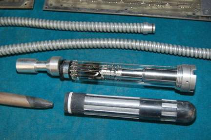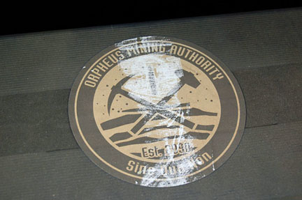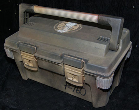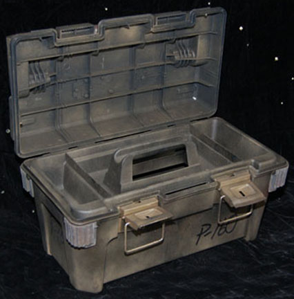 Description: A toolbox featured in the Star Trek: Enterprise episode “Terra Prime” during scenes in which “Commander Tucker” altered the weapons trajectory of the Verteron array on Mars. The item is a fully practical plastic tool box with a hinged lid, a pair of metal clasp seals, a swinging handle that folds into place in the lid for a more compact profile, and a removable interior section that allows for easy access to smaller tools. The item is externally distressed to appear used and ‘dirty’, an Orpheus Mining Colony application is adhered to the lid and has suffered from the removal of a strip of adhesive tape though the graphic is still plainly visible. Inside the tool kit is an array of differing knick-knacks presumed to be futuristic ‘tools’. A pair of unused circuit boards are present, a pair of prop components, one made to look intact, the other distressed to appear ‘blown’, a former specially developed glass encased light filament with an additional aluminum metal accent on the end, a six other blown light bulbs of a smaller variety, a molded rubber hand prop painted black and metallic silver, and four other interesting looking implements and tools. The case, when sealed shut measures approx. 20 X 11 X 11 inches, and the exterior is marked P-60 on several surfaces due to post production use, prior to the auction.