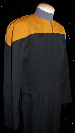 Description: A lot of costumes and costume items featured in various episodes of Star Trek: Voyager. This lot consists of a long-sleeved, full-length, black Starfleet jumpsuit with Operations Gold division strip along the shoulders, an open necked, collar, Velcro patch for a commbadge (not included), hoops at the waist for tools, stirrups for the feet, two sleeveless, one tank top, and one long-sleeved, blue-gray undershirt that is open almost all the way down. Sewn in tags in virtually every garment denote wear by Tim Russ.