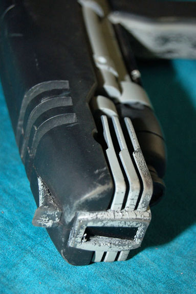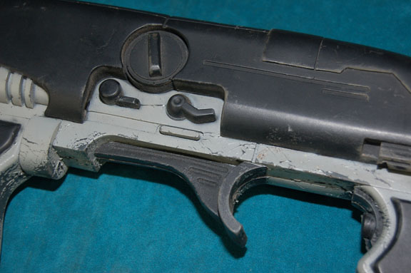 Description: STAR TREK: ENT “MACO ENERGY RIFLE” A prop weapon featured in various episodes of Star Trek: Enterprise. This item is similar to those used by the M.A.C.O. (Military Assault Command Operations), various members of Starfleet and the Terran Empire as well. This item resembles the current MP5 submachine gun but is rubber cast in gray and black, featuring an attached stock, hoops for a carrying strap, several faux “switches”, deeply grooved accents along the barrel, and black acrylic for the “emitter”. The item measures approx. 25 X 2 X 7.5 inches.