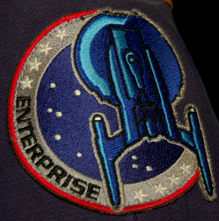Description: A female Starfleet jumpsuit with Command gold trim around the shoulders made for use during the Star Trek: Enterprise series. It has a famous NX-01 Enterprise patch on the left sleeve, a zip up the front and multiple zippered pockets. There are zips and adjustable Velcro fasteners at the cuffs and ankles. Worn under the jumpsuit is a long sleeved black shirt with buttons up the front. Costume comes complete with costume tag.