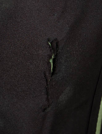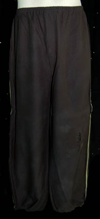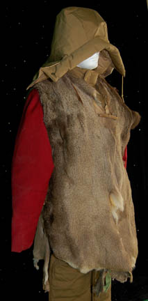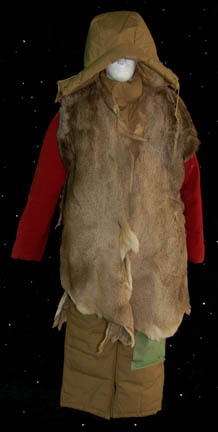 Description: A costume featured in Star Trek VI: The Undiscovered Country for wear by a stunt performer portraying “Dr. McCoy” in scenes taking place in the Klingon mining colony of Rure Penthe as additional elements to an existing Starfleet uniform. The costume is two halves of a maroon jacket wrapped around and affixed to a ‘Cabela’s’ outdoor sport coat which features a hood that attached via Velcro and snaps, and matching trousers, with outer layer Starfleet style black officer’s trousers with green medical division stripes running down the outside seams. Also included is a fur vest that was not located with the costume. The costumer’s tag reads ‘Bones , St. Dbl. Rura Penthe’.