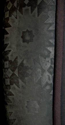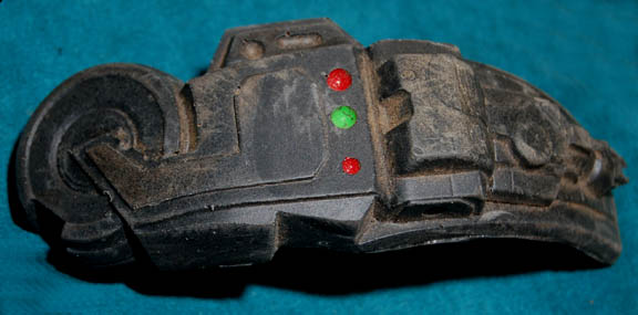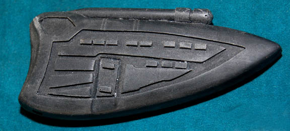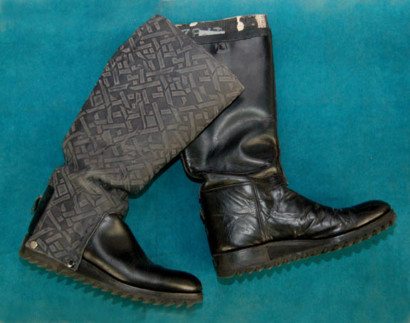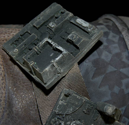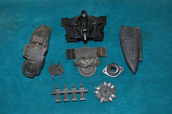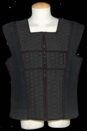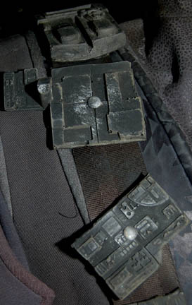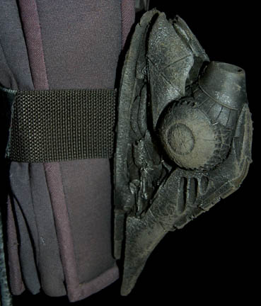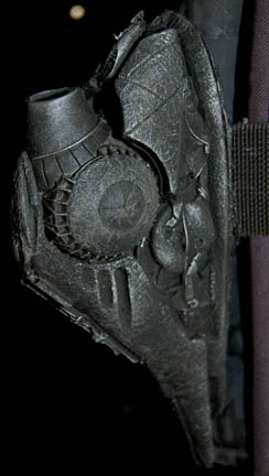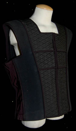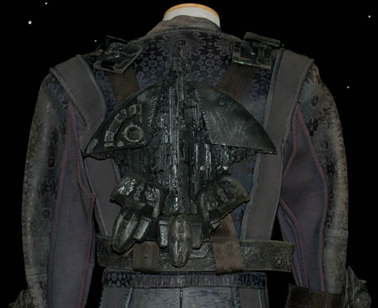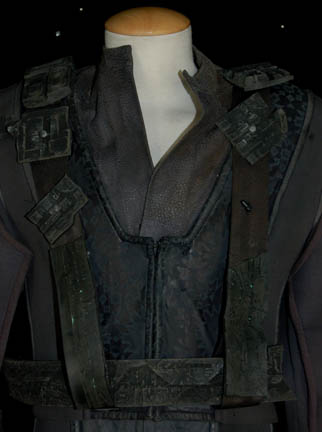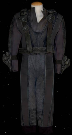 Description: A costume featured in various episodes of Star Trek: Deep Space Nine. This costume consists of a sleeveless, full-length, jumpsuit with the top half a black, spandex-like material, the bottom being neoprene over a gray fabric featuring a starburst pattern down the middle and stirrups for the feet. Also included is a vest of further neoprene under sections of black, lattice textured and wrinkled fabric separated into further sections by oversized black piping, a distressed jacket matching the lower-half of the jumpsuit, faux suede around the collar, fabric, an unattached pocket that is supposed to go on the right leg, a wide belt and bandolier featuring intricate rubber and molded foam accents that have started to dry out due to time and storage; multiple loose costume accessories with rubber, resin, or metal components and some with Velcro placements, and two of the black, molded-rubber, wrist phasers. Knee-high, black, leather boots in a matching motif with the belt/harness and in a corresponding color to the rest of the costume. With this costume comes the Jem’Hadar melee weapon, a prop Kar’takin, it is a short, wooden pole-arm type weapon with a weighted metal-colored end, the blade is molded plastic on a metal frame, is long, vaguely triangular, straight edged to a point and made for stabbing and slashing in battle. Multiple tags denote use by multiple actors and stuntmen and the costumer’s tag denotes it as the “Old Style”. 6145