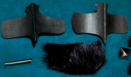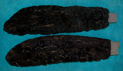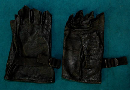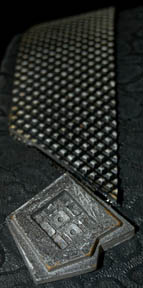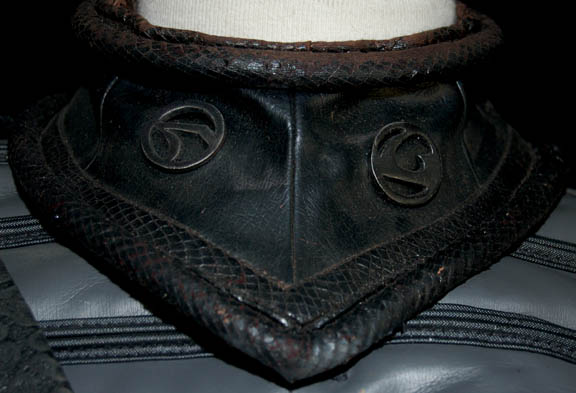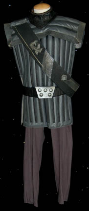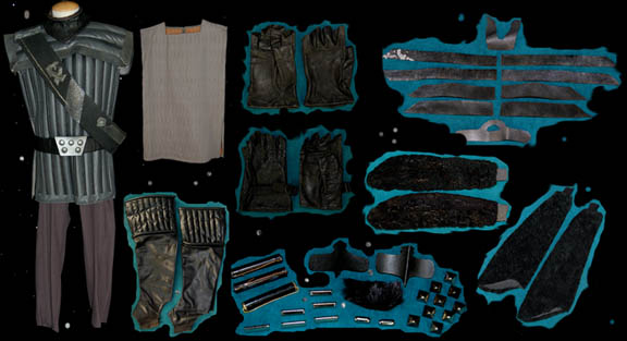 Description: A lot of Klingon costume items featured throughout Star Trek: Deep Space Nine. This lot consists of a gray, leather/vinyl pleated, jacket featuring textured, vertical stripes, a dark-gray, shoulder “armor” piece with diamond-shaped rubber detail, metal accents and horizontal, black stripes above them. A long, sleeveless, gray undergarment with large vertical pleats, one of the trademark Klingon trapezoidal belts with the five raised dots on them, a black vinyl, baldric sash featuring similar, diamond-shaped rubber accents, a resin and a gorgeous metal iconographic symbol, metal chainmail, and a Velcro closure on the bottom. A black leather gorget featuring black, rubber piping and Klingon iconographic symbols, two pair of black, leather gloves with trimmed fingers and “claws” on the ends, a bag of metal, plastic, and rubber costume accessories. Four black, faux-fur sleeves featuring gold-colored thread, and gray, overall-style trousers with stirrups for the feet, and black, vinyl spats. Multiple labels denote use by many actors. 6146