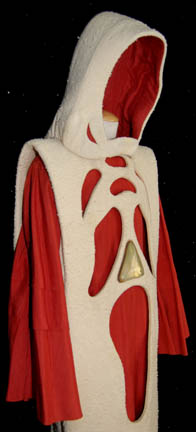 Description: A costume featured in Star Trek III: The Search for Spock for wear by an attendant to the High Priestess “T’Lar” (Dame Judith Anderson). The costume is a red robe with wide pleated kimono style sleeves, a cream colored over robe with geometric cut outs, and a sturdy hood that matches the over robe and attaches at the neck. The over robe features a large ‘gem’ of translucent resin with a metal frame which is affixed to the garment. The hood is lined with red fabric internally and stands up on its own to frame the wearer’s head without touching it. The costumer’s tag reads ‘Attendant to the High Priestes Sc 283’ and the costume is one of only two known to exist.