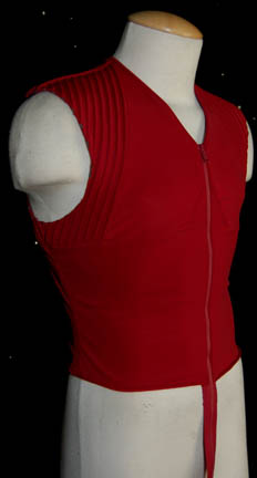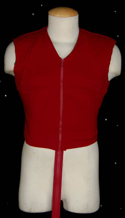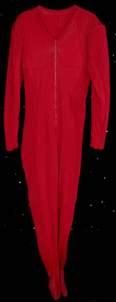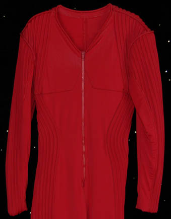 Description: STAR TREK: ENT “MACO EVA UNDERSUIT LOT” FROM “ANOMALY” AND “EXTINCTION” A full length costume jumpsuit for wear Nathan Anderson as “Sergeant Kemper” in the Star Trek: Enterprise episode “Anomaly”, under an ‘extra vehicular' or ‘EV’ suit, the style of which was used by MACOs. The jumpsuit is red with multiple lines of tubing along the shoulders, ribs, outer arms, and down the legs to give it a ribbed appearance, and includes attached feet. The costume zips up and also included are two matching sleeveless shirts of the same style and color for wear by Trek regular Daniel Dae Kim as “Corporal Chang” in the episode “Extinction”. Costumer’s tags denote use by Daniel Dae Kim as “Corporal Chang” and Nathan Anderson as “Sergeant Kemper”.