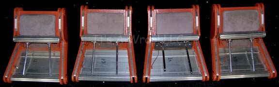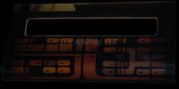 Description: A lot of items featured in various episodes of Star Trek: Voyager including “Drive”; wherein “Tom Paris” (Robert Duncan McNeill) enters the “Delta Flyer” in a goodwill interstellar race but finds it sabotaged by someone who wants to prevent such sentiments. This lot includes three LCARS (Library Computer Access and Retrieval System) panels; rectangular pieces of smoked acrylic, curved on the ends, featuring graphical applications adhered to the reverse of various shapes and colored “controls” labeled with letters and numbers, and a rounded, rectangular piece cut out of the top for another LCARS panel. One of such panels features silver detail, its own graphical application of two ascending lines of numbers with a wavelength graphic between them. Included are four of the seat back head rests also featured in various scenes on the “Delta Flyer”; an orange frame, metal inset and detail, two notched poles that attach to the seat to adjust the height, an indented rod shaped neck rest, a rectangular, mauve-colored cushion, three banks of multi-colored blinking lights on the reverse, and an activator switch towards the bottom on the left. The lights on all four items work but the activator switch on one of them needs to be resoldered. Beneath the cushion is the circuitry involved with the blinking lights, that runs on four nine-volt batteries. The LCARS panels measure approx. 17 X 9 X 2 inches and the seat back measures approx.20 X 15 X 10 inches.