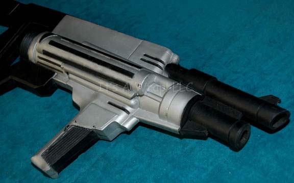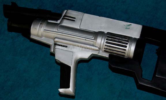 Description: A prop weapon featured on various episodes of Star Trek: Enterprise for use by “Enterprise NX-01” crewmen for any situation that calls for more firepower than the standard phase pistol. The item is rubber cast with the main body in silver, the muzzle and attached stock in black, and measures approx. 28 X 8 X 3 inches.