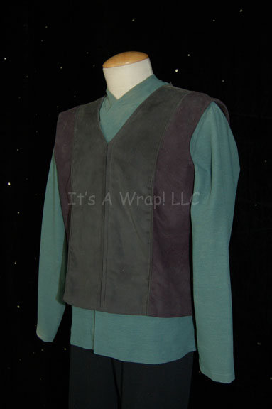 Description: A costume featured in the ninth Star Trek feature film, “Insurrection”; wherein “Captain Picard” (Patrick Stewart) and the crew of the “Enterprise-E” rebel against Starfleet and the Federation itself to prevent the exploitation of a defenseless race called the Ba’ku. This costume consists of a long-sleeved, light-blue, tunic featuring an open-neck collar, dark-blue, overall-style trousers with stirrups for the feet, and a dark and light blue, two-toned, suede vest. The tunic has minor fading along the collar due to time and storage and the vest still features grass stuck to it from production use. A sewn in tag reads ‘Data Stunt’.