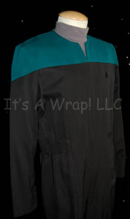 Description: A costume similar to those featured throughout Star Trek: Voyager. This costume a long-sleeved, full-length black jumpsuit featuring Sciences Blue division colors around the shoulders, hoops at the waist for tools, a Velcro patch for a commbadge (not included), stirrups for the feet, and a long-sleeved, blue/gray undershirt. A sewn in tag reads ‘Voyager, John Kim’ and a costumer’s tag that reads ‘Size 42, John Kim’.