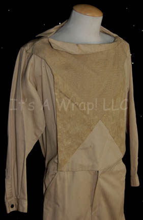 Description: A costume featured in the Star Trek: The Next Generation episode “We’ll Always Have Paris”; wherein the “Enterprise-D” is called in to rescues a doctor and his wife from the time-gravity experiments he has been working on. This costume is for wear by Rod Loomis in the role of the temporal scientist “Dr. Paul Manheim”, it is a long-sleeved, full-length, tan-colored jumpsuit featuring triangular, textured accents along the chest, a wide thin, collar, snaps down the right shoulder, and minor distress due to almost twenty years of time and storage. A costumer’s tag reads ‘We’ll Always Have Paris, 40271-124, Dr. Manheim, Rod Loomis, 1, 11a-42’.