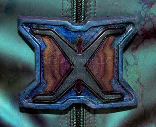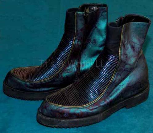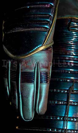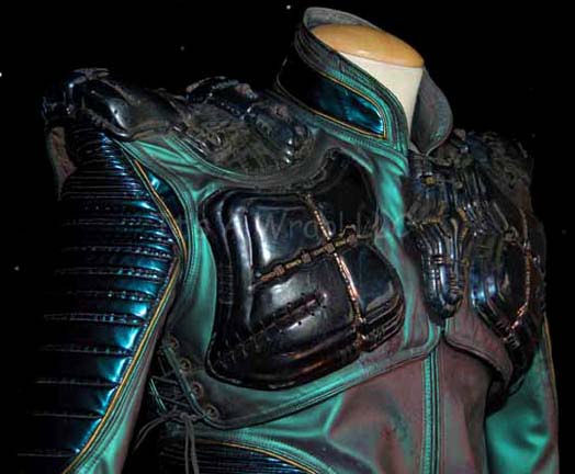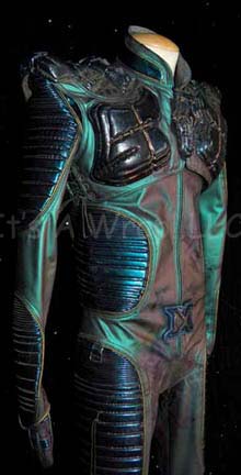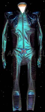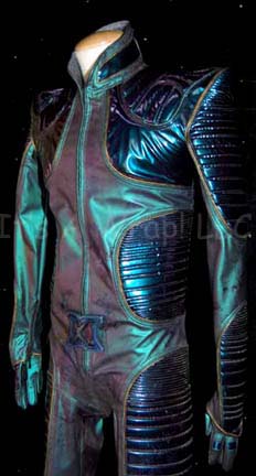 Description: A costume featured in the tenth Star Trek feature film “Nemesis”; wherein a political coup takes place in the Romulan Empire and the crew of the “Enterprise-E” travel into its heart and “Captain Picard” (Patrick Stewart) finds a familiar face planning the destruction of Earth. This costume is for wear by Remans, the worker class of the Romulan that live on the darkside of the Romulus’s twin, Remus; it is a long-sleeved, full-length, molded vinyl, iridescent purple jumpsuit featuring gold-colored piping, reinforced, pleated vinyl pads all along the surface of the suit, zip cuffs and ankles, a zip front, matching gloves and shoes, and a molded vinyl, chest/shoulder armor piece with a variety of stitched in metal details and a Velcro seal. The shoes have a tag that denotes wear by veteran stunt-person/stand in Tom Morga but no other tags are found.