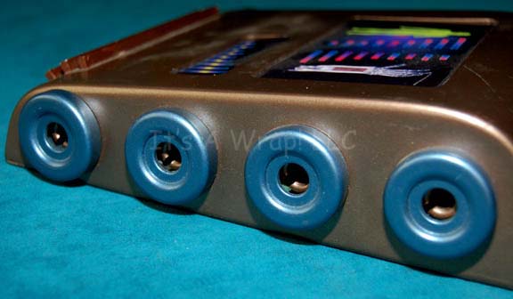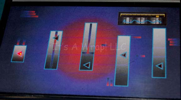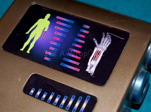 Description: A lot of two prop medical devices featured in the Star Trek: Voyager episode “Critical Care”; wherein “The Doctor” (Robert Picardo) is kidnapped by a merchant and forced to work on a humongous hospital ship and tries to change the appalling conditions present there. The first item is an irregularly-shaped, copper-colored device featuring a large “display screen” with a graphical application of a full-body and elbow-to-fingertip skeletal scan and a second “scan” beneath; raised, rust-colored accents towards the bottom and four, light-blue, screw-in knobs. The next item is a dark-gray, molded-plastic case featuring a large graphical application of several, variously sized, gray rectangles with a single red, blinking triangle on each one representing one of the patient’s vital signs on a violet back ground with a large, central, sphere shape; a molded, plastic handle, and the circuitry for the lights. The first item measures approx. 9 X 7 X 2 inches and the second 9.5 X 8 X 2 inches.