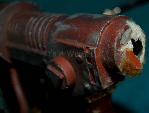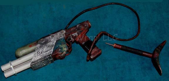 Description: A prop laser mining tool made for and featured in Star Trek VI: The Undiscovered Country. The item is made from molded resin and metal components, the tri-barrel emitter is made from silver colored metal as is the barrel shield that has been dulled down to appear used. The item is painted red and green and featured Klingon themed decals. A covered cord extends away from the item and a button ‘trigger’ is present. The shoulder brace is broken free of the item and clearly is fortified by metal. The two pieces depict evidence of previous repair and part of the item is chipped where the pieces connect. The item is said to be one of only four ever produced and measures approx. 18.75 X 4.75 X 8.75 inches while the additional brace measures approx. 12.25 X 2.25 X 7.25 inches.