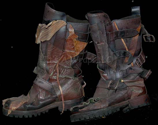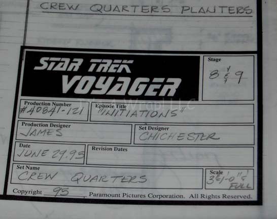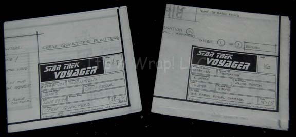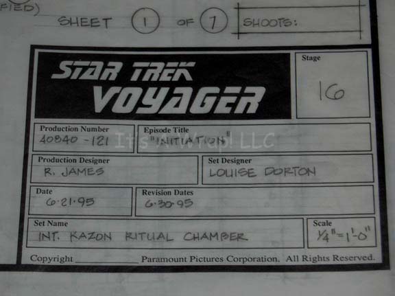 Description: A lot of two items from the Star Trek: Voyager episode “Initiations”; wherein “Commander Chakotay” finds a lone Kazon child (Aron Eisenberg) and becomes involved in the boys passage into adulthood. This lot consists of a pair of Kazon boots worn by Aron Eisenberg, “Nog” of DS9 fame, in the role of the Kazon child; brown leather boots featuring variously sized and textured pieces of suede, a buttoned strap, and metal buckles down the side. Also included is a blueprint schematic of the interior of the Kazon ritual chamber and another of crew quarters aboard “Voyager”. The boots are labeled for wear by Aron Eisenberg and the schematics both feature the show name, stage, production number, episode name, original date, set name, production and set designer, scale all on a panel in the lower right hand corner.