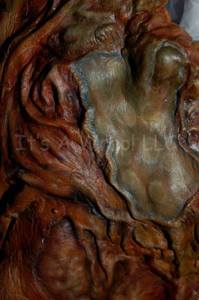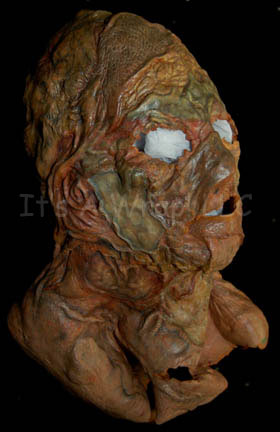 Description: A special effects make up mask created for the Star Trek: Voyager episode “Phage” or “Faces” where it may have been recreated or reused. The item is a molded foam rubber mask fashioned and painted to represent the mottled mess of a Vidiian head made up of scavenged alien flesh as a symptom of the degenerative plague in their alien society named ‘the phage’. The mask covers the entire head with holes for the mouth and eyes, in those places and around the edges of the neckline the mask is dry and some flaking and cracking has occurred. The mask will continue to break down over time but for now it is in otherwise intact condition and retains its appeal.