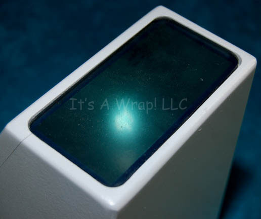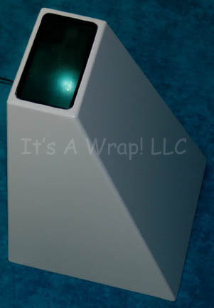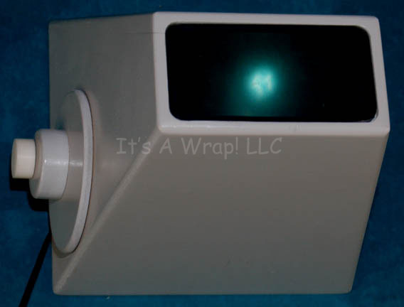 Description: A science station scope like the one featured in the Star Trek: Enterprise episode “In a Mirror, Darkly: Parts I and II”. The item is made from shaped wood with an acrylic ‘viewer’ eyepiece that is colored by a blue gel sheet adhered to the reverse with a mounted light bulb. The item features a rotating dial on the left side with no actual function and activates through the use of a plug and wire which functions on standard American electricity on a repaired Type-B plug (item was restored to working order due to previously removed power plug and is not originally a grounded plug). The item measures approx. 10 X 9 X 12 inches.