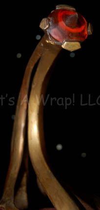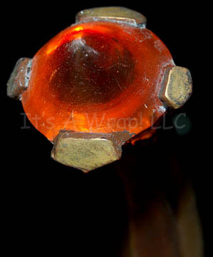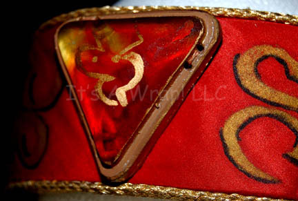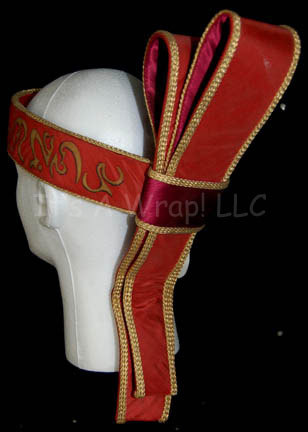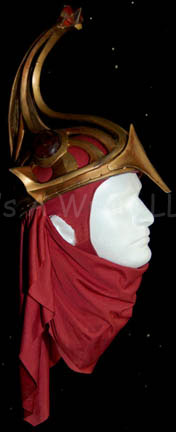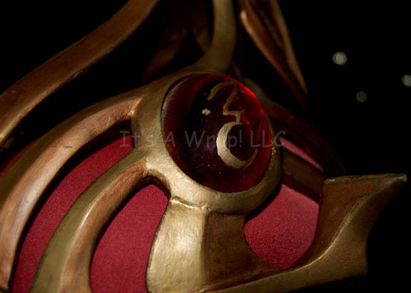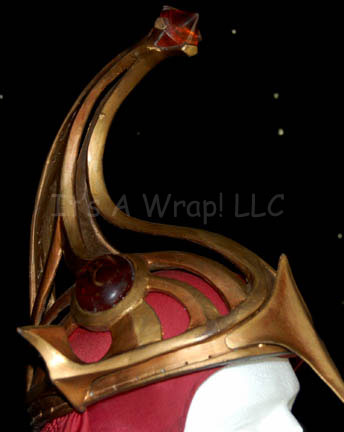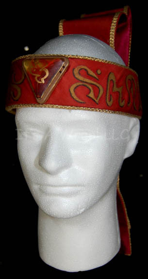 Description: A lot of two head pieces featured in Star Trek III: The Search for Spock worn by Vulcan Fal-Tor –Pan Ceremony attendees. One item is the head dress of a Vulcan ceremonial guard from comprised of a red fabric skullcap mounted inside a gold painted resin frame that features Vulcan ‘gems’ on the left and right with iconography painted onto them, and a larger ‘cut gem’ embedded into the horn on top. The item also features covering with openings for the famous Vulcan pointed ears and ties under the chin. The other head piece is a head band for a Vulcan gong striker. The item is rust colored with gold colored trim, a triangular ‘gem’ in the forehead with iconography painted on it, and a bow styled compliment for the back of the head. These items complete costumes that were sold in previous auctions.