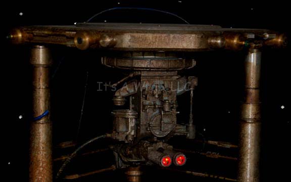 Description: A prop item featured in the Star Trek: Enterprise episode “Divergence”; wherein the “Enterprise NX-01” gets the help of the starship “Columbia” to help repair the sabotage sustained by the Augments and tries to rescue “Dr. Phlox” (John Billingsley). This item is the microscope that “Dr. Phlox” (John Billingsley) and the Klingon doctor “Antaak” (John Schuck) use in an attempt to find a cure to the mutagenic virus that is afflicting them; it is the same brown/rust color that is so prevalent in the Klingon culture, a rounded diamond-shaped base, a non-working “light bar”, three metal posts support a matching top portion with several nodules extended from it that have tubes leading out from a few that either attach to the microscope “mechanism” itself or another nodule along the top. The intricately-carved “mechanism” extends down from the top and has further tubes around it and two eyepieces with three red lights each that activate via a switch on the side of the mechanism. The item measures approx. 18 X 21 X 23 inches.