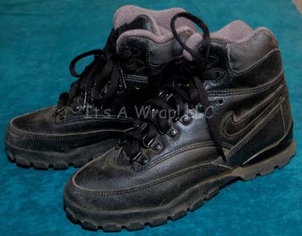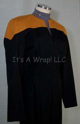 Description: A lot of costume items and a Starfleet uniform featured in various episodes of Star Trek: Voyager for wear by Roxann Dawson in the role of “Chief Engineer B’Elanna Torres”. This consists of one of the Starfleet uniform, blue/gray, sleeveless undershirts sewn onto some jumpsuit trousers believed to have been featured in the episode “Course Oblivion” and similar to that featured in the episode “Juggernaut”; a long-sleeved, undershirt with no zip and open in the front. A uniform jumpsuit consisting of a long-sleeved, full-length, black jumpsuit featuring Operations Gold division colors around the shoulders, hoops at the waist for tools, a Velcro patch for a commbadge (not included), stirrups for the feet and a long-sleeved, blue/gray uniform undershirt with snaps for provisional rank (included but not attached), an extra undershirt, and brown trouser with a velvety appearance. Also included are a pair of leather/suede hiking boots believed to be from the episode “Basics: Part II” that still retain dust and rocks in the tread from production use. The uniform jumpsuit, the brown trousers, and several of the undershirts feature sewn in tags that read ‘Voyager, Roxann Dawson’ or “Roxann Biggs”; the boots feature a label that reads “Roxann Biggs-Dawson” and two items have no tags but were found with items that did in the Roxann Dawson section.