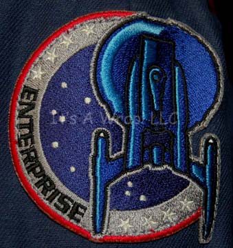 Description: A costume featured variously throughout Star Trek: Enterprise. This costume is a standard 22nd century Earth Starfleet uniform consisting of a full-length, long-sleeved, blue jumpsuit with seven functional, zipped pockets, Operations Red division strip, zipper/Velcro cuff adjustment for the wrists and ankles, Enterprise patch on the left shoulder, two rectangular pips denoting the rank of lieutenant just below the right shoulder, a black, sleeveless undershirt, and a pair of black, leather, Enterprise-style Starfleet ankle boots. A sewn in tag reads ‘Enterprise, Dominic Keating, Season 4 #1’.