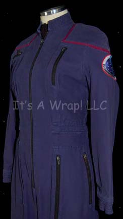 Description: A costume featured variously throughout Star Trek: Enterprise. This costume is a standard 22nd century Earth Starfleet uniform consisting of a full-length, long-sleeved, blue jumpsuit with seven functional, zipped pockets, Operations Red division strip, zipper/Velcro cuff adjustment for the wrists and ankles, Enterprise patch on the left shoulder, and a black, long-sleeved undershirt. A sewn in tag in each garment reads ‘Enterprise, Dawn Deninger’.