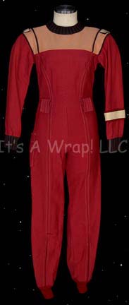 Description: STAR TREK: FEATURE FILM “ABLE SEAMAN COMMAND DIVISION CREWMAN’S STARFLEET UNIFORM” A costume style first appearing in Star Trek II: The Wrath of Kahn and continuing to be in use through the opening sequence of Star Trek: Generations. This costume consists of a long-sleeved, full-length red jumpsuit with tan shoulders, black cuff and collar ribbing, white Command division strips for the shoulders and black trim; black stripes that follow up the sleeve, along the ribs and down the outside of the leg. Matching faux “pocket” on the right thigh, stirrups for the feet, a diamond shaped, wire-backed, metal colored badge on a red, fabric background denoting the rank of Able Seaman, a silver-colored, gold-trimmed metal pin-backed badge featuring the name “Branz”, and a pair of black “Puma” athletic shoes with red accents of the Starfleet insignia with wear from time and storage that make them rather fragile.